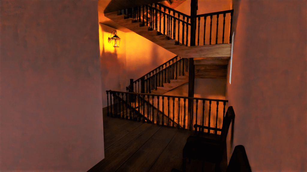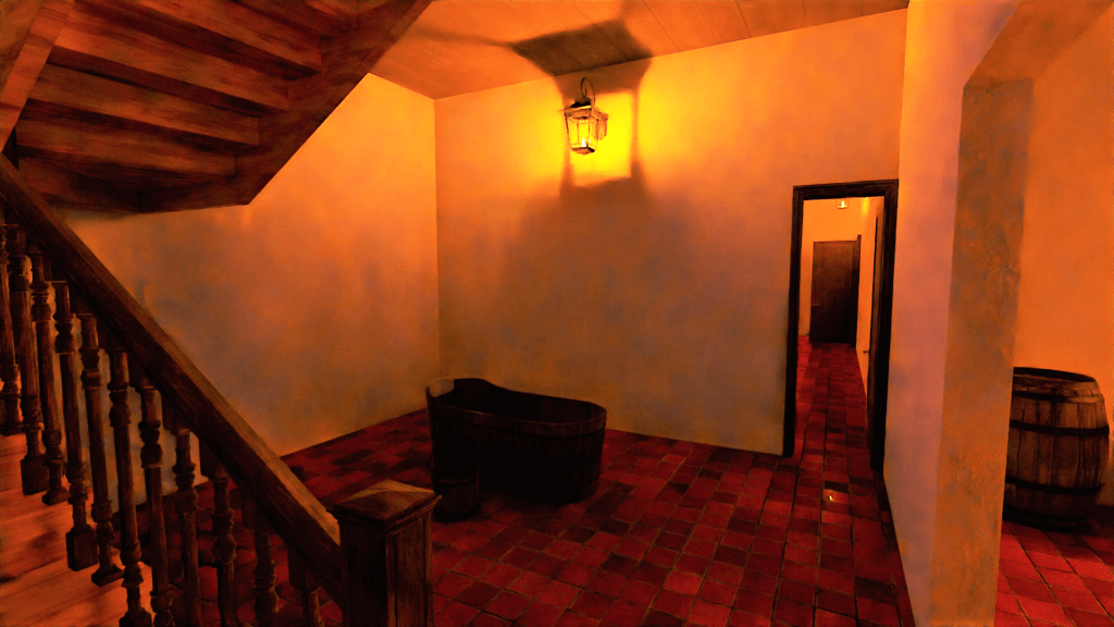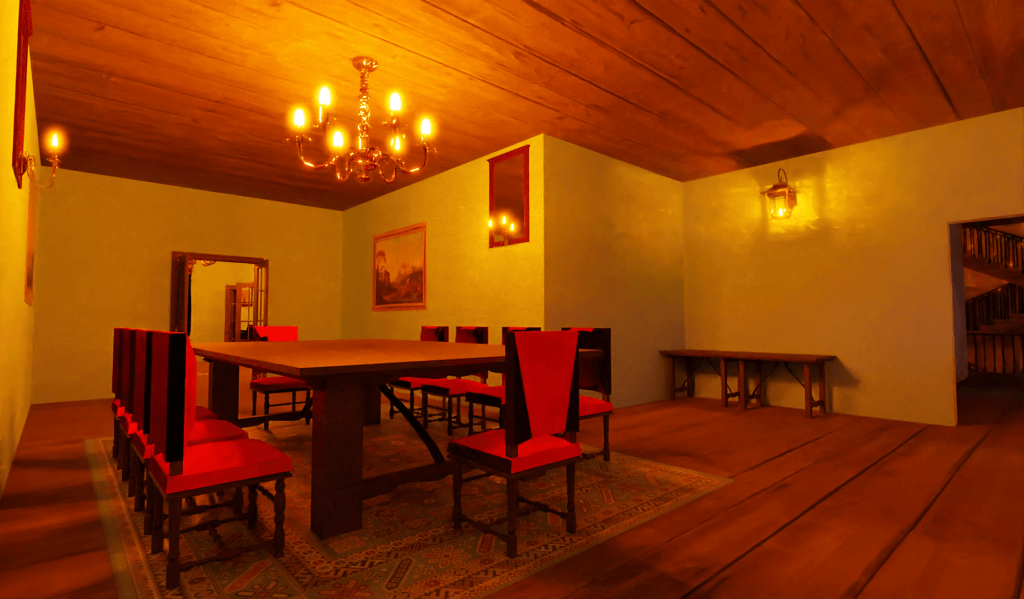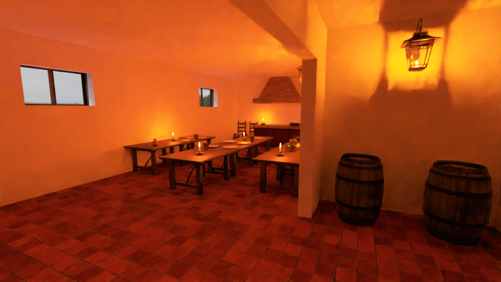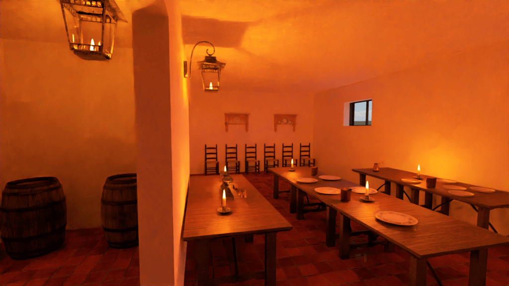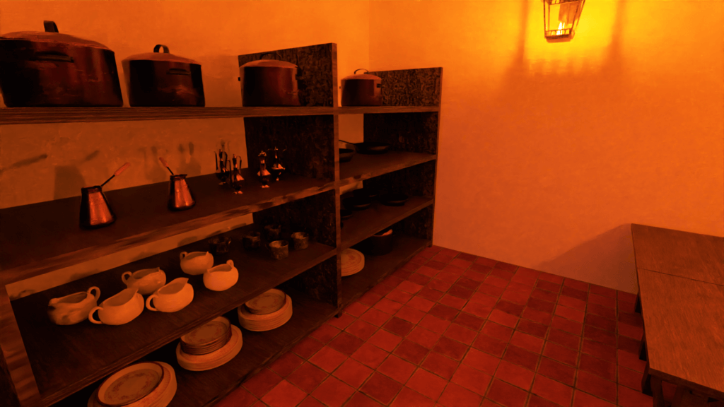 En la parte de atrás dando al jardín están las dependencias de la cocina: un cuarto antes de entrar con una mesa, luego la cocina: 7 mesas, el hogar con su chimenea, y al lado la despensa con el menaje: no hace falta que cuentes todos los cacharros, no hay tiempo, tú pon chocolateras, salseras, vasos, calderos… Ah, y en las escaleras y el pasillo, los faroles. No hay nada roto, mejor así.
