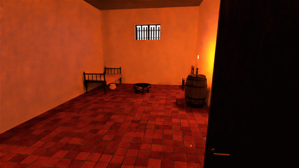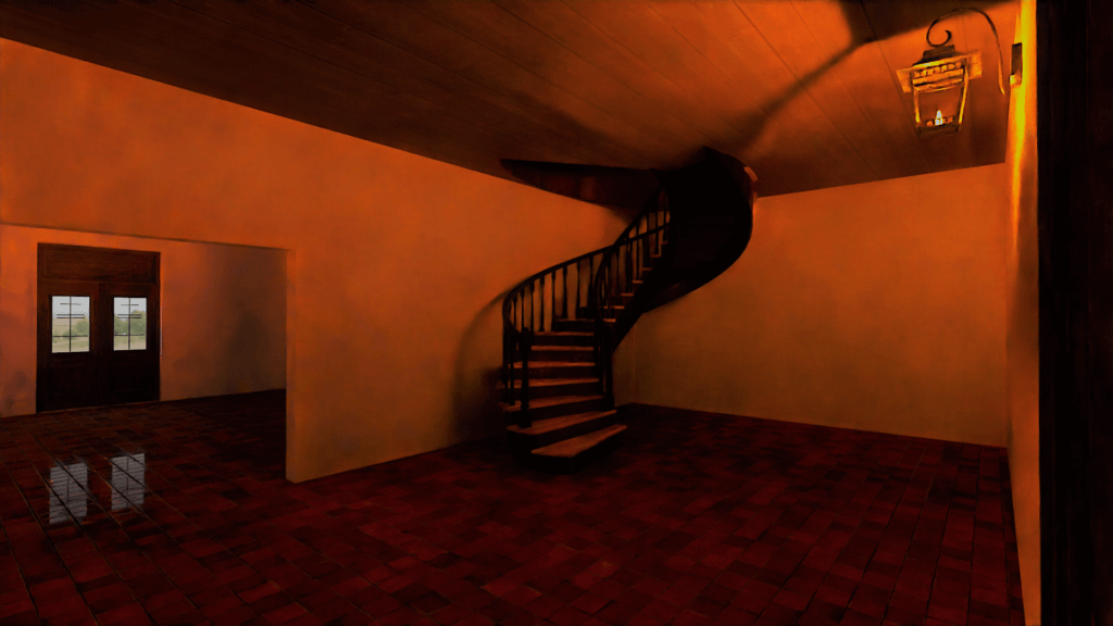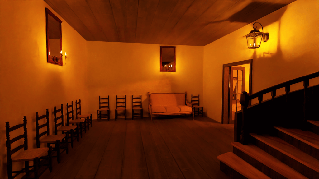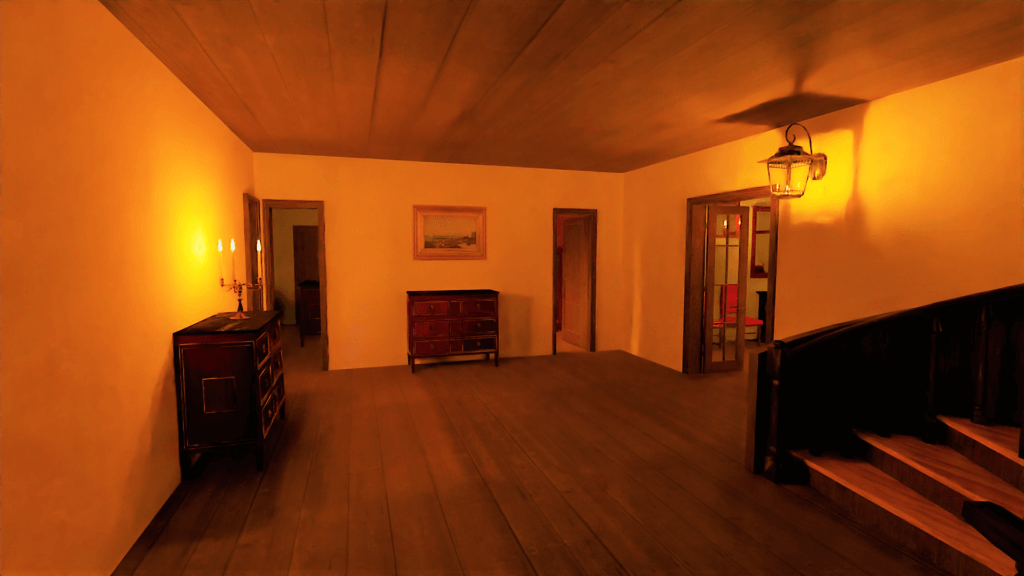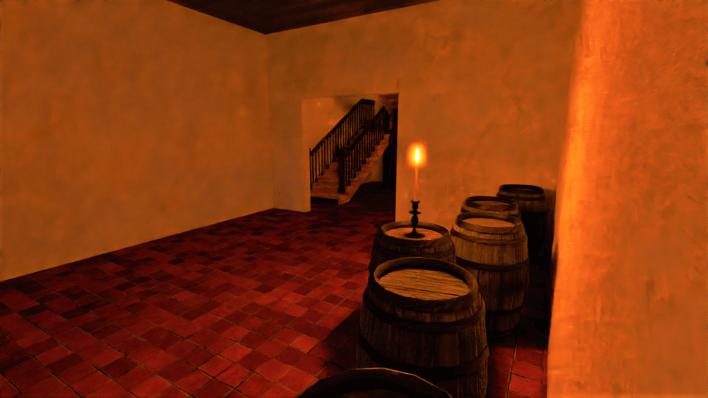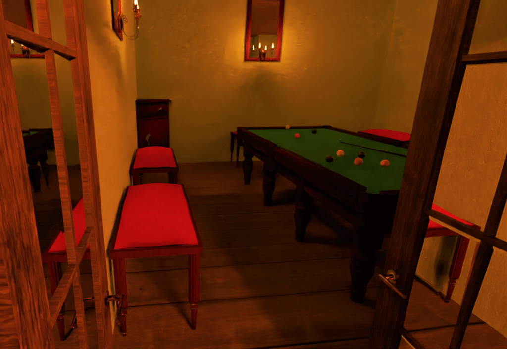 En la parte de atrás dando al jardín están las dependencias de la cocina: un cuarto antes de entrar con una mesa, luego la cocina: 7 mesas, el hogar con su chimenea, y al lado la despensa con el menaje: no hace falta que cuentes todos los cacharros, no hay tiempo, tú pon chocolateras, salseras, vasos, calderos… Ah, y en las escaleras y el pasillo, los faroles. No hay nada roto, mejor así.