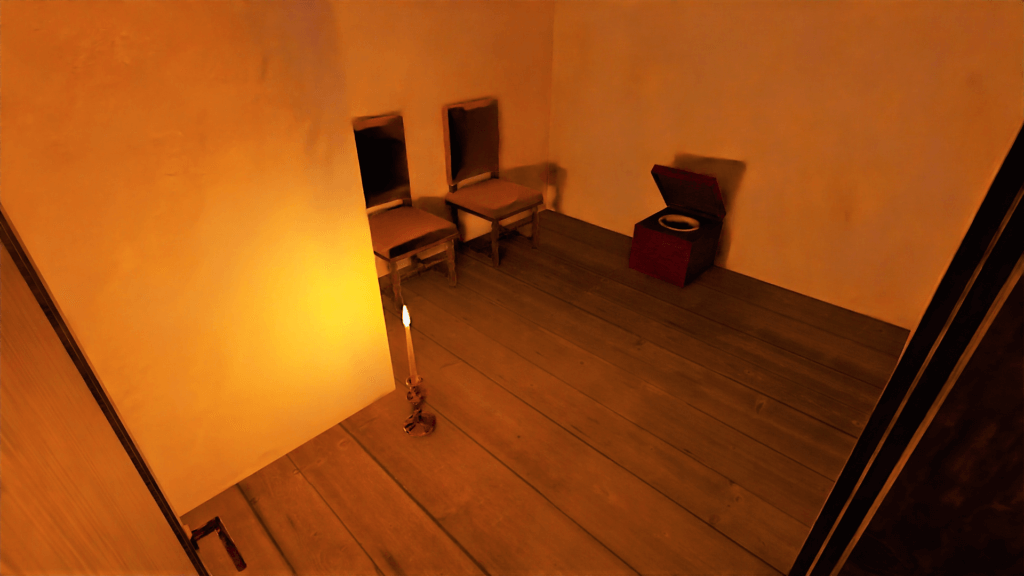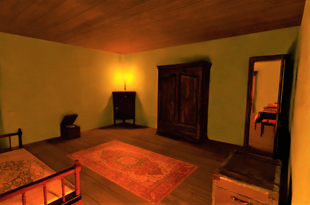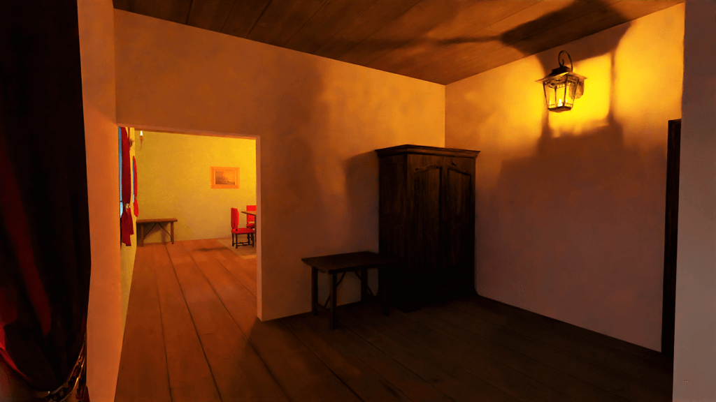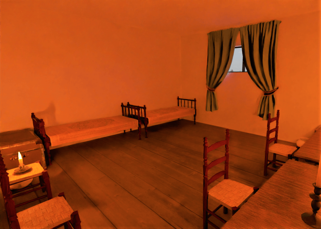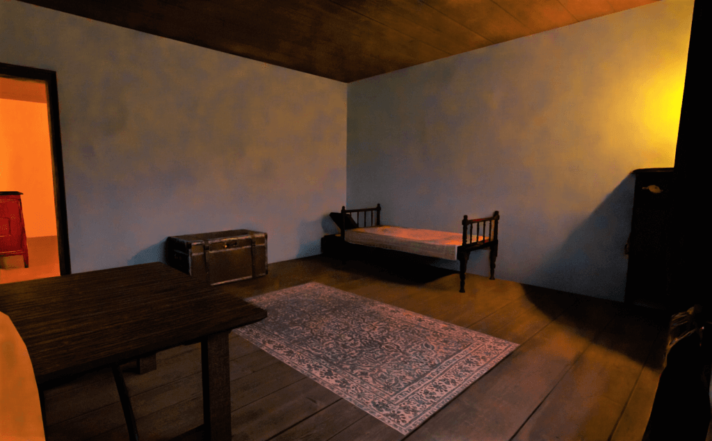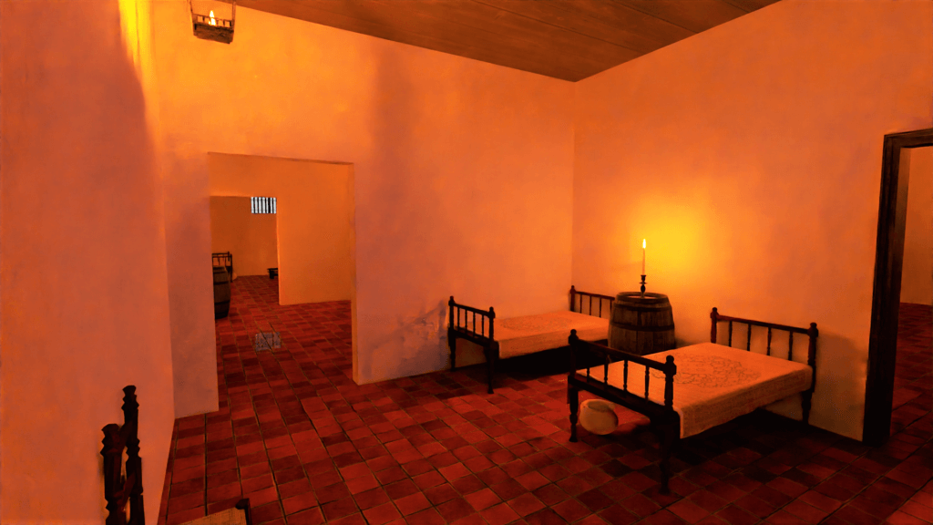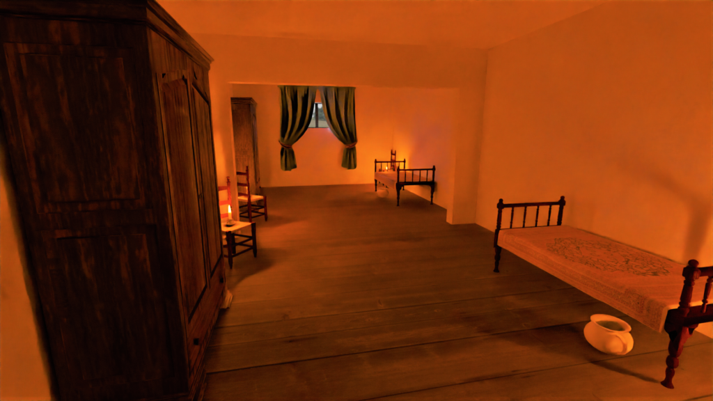 Y ahora nos vamos para arriba, a la planta del servicio. Uno, dos, tres… cinco dormitorios del servicio con sus camas, sus mesas, sillas de paja, orinales, armarios, braseros de cobre, y cortinas azules.