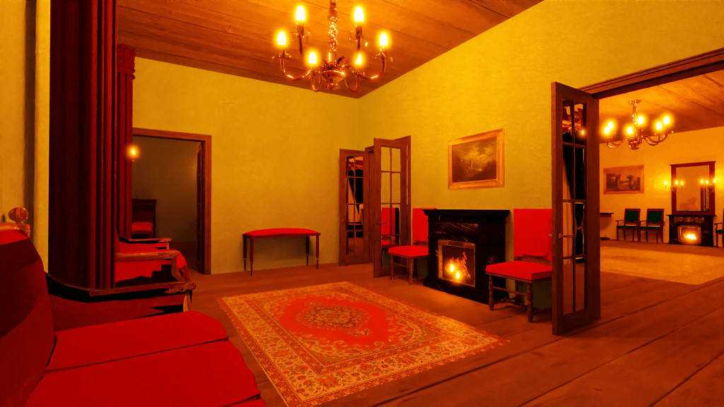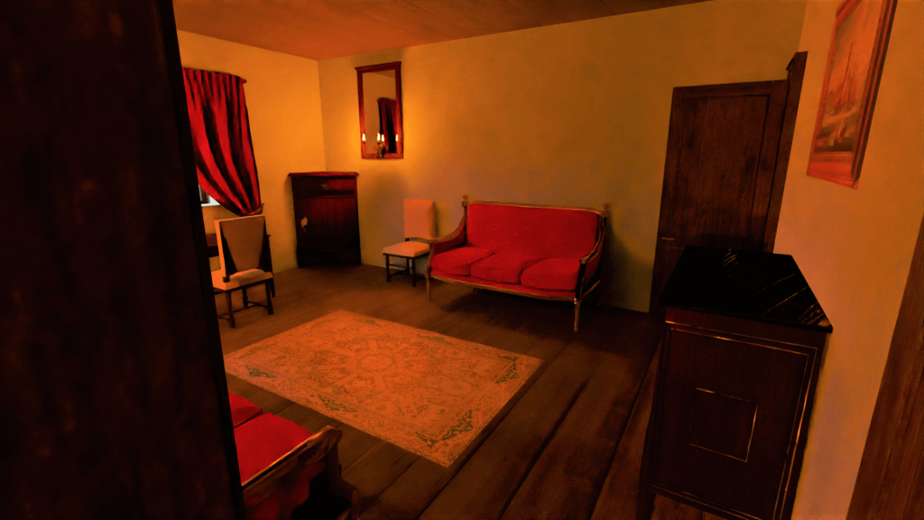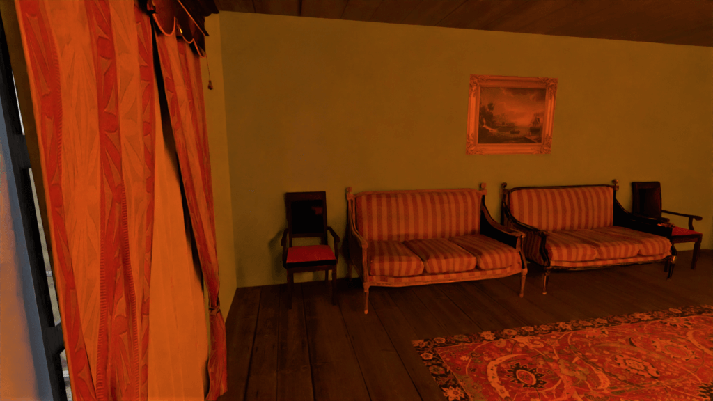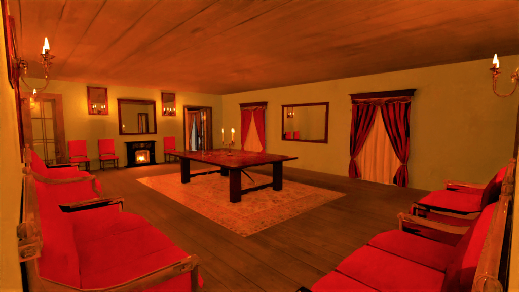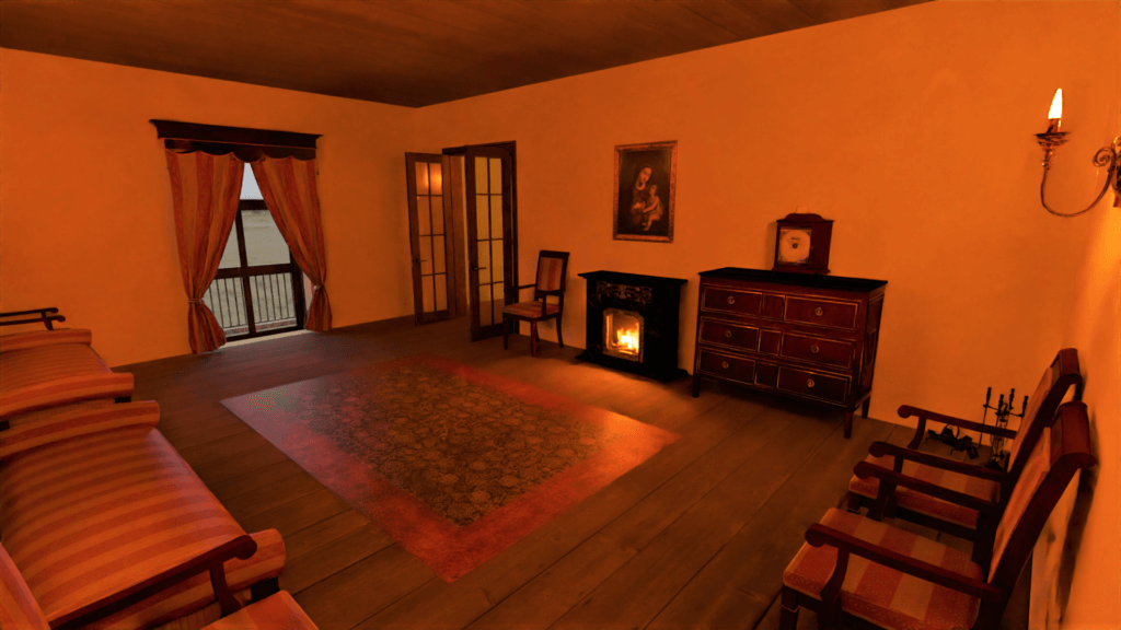 Vamos a la segunda planta donde está la vivienda. ¡Deja de mirar el cuaderno, que vas dando traspiés, majillo! En la sala principal, apunta una mesa grande, 4 canapés, sillas y cortinas en damasco carmesí, candeleros, cuadros, otros dos espejos grandes, otra chimenea con sus accesorios, cornucopias y una alfombra grande de color rosa con flores.