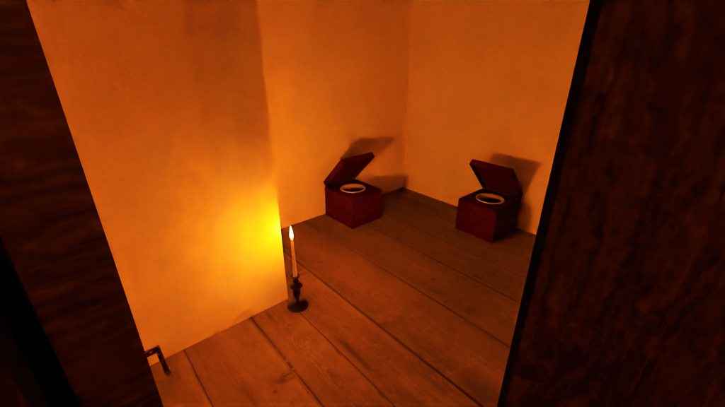 Volvamos a la escalera principal y esto te va a encantar: un cuartito retrete con una caja para guardar el orinal, no, son dos, a ver… sí, de caoba. ¡Caoba para la m…, vaya caprichos que tienen los gabachos!