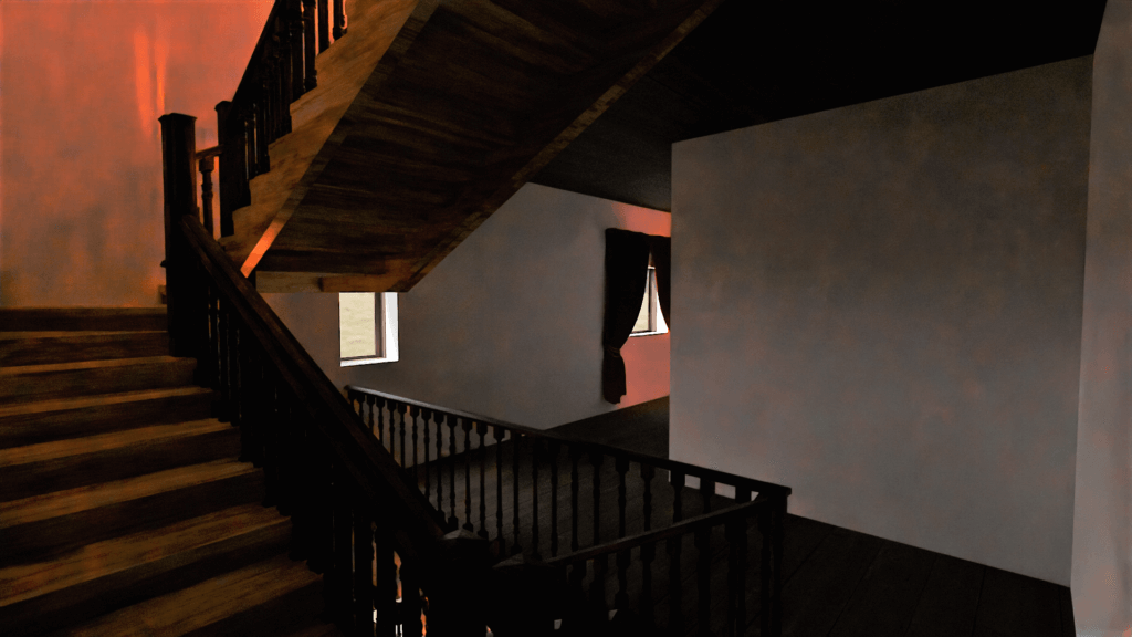 Por el fondo se abre a un espacio entre las dos escaleras, sería como un aparador para el servicio del comedor, porque, mira, por la escalera de servicio que está allí al fondo, los platos llegan directamente de la cocina de arriba.