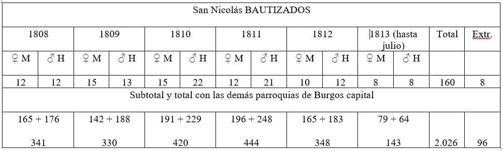 Habiendo tenido acceso en el Archivo Diocesano de Burgos a un libro de registros parroquiales antes extrapolado, se pueden ampliar las estadísticas de población que aparecen en el libro, sumando los datos de los bautizados en la parroquia de San Nicolás entre 1808 y julio de 1813.